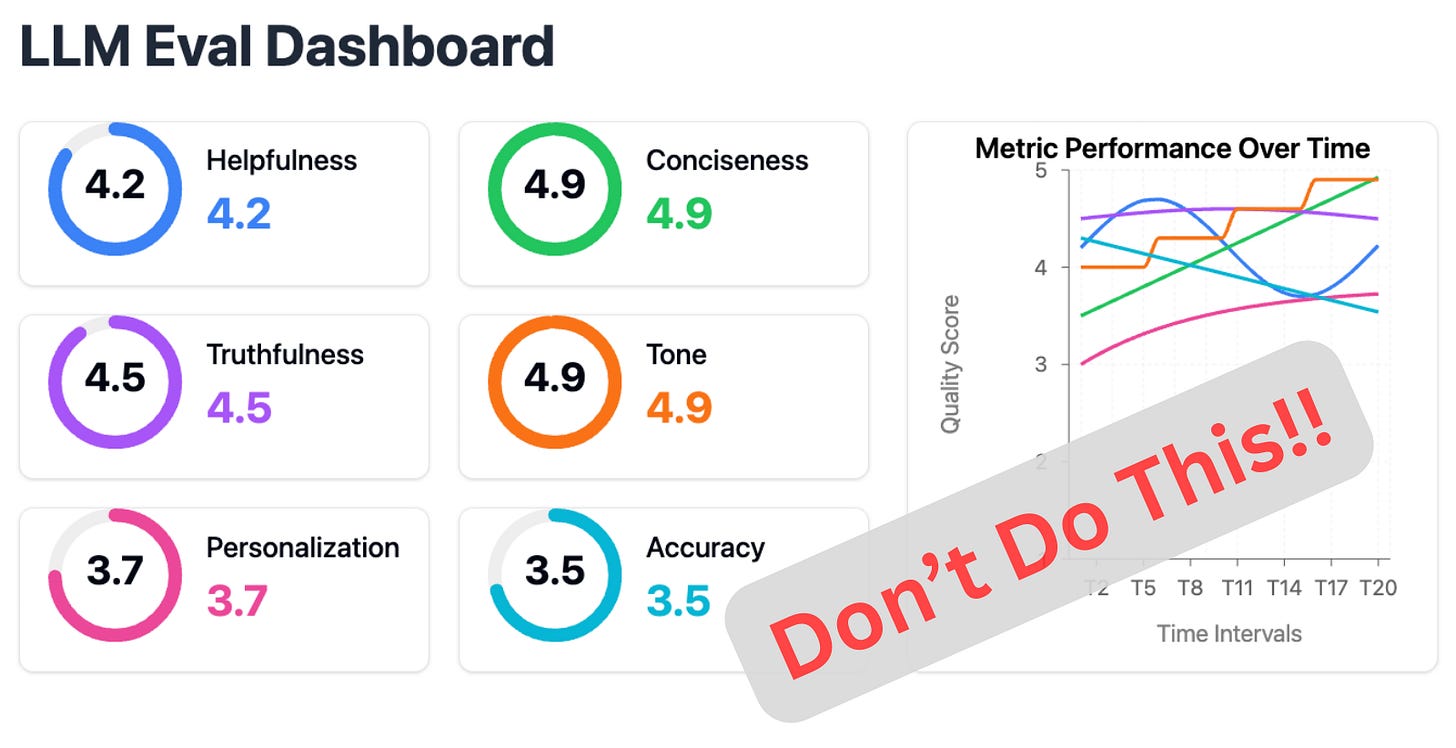 It’s a scene I’ve witnessed at countless companies: a dashboard filled with colorful charts, each tracking a different abstract quality—"Conciseness," "Truthfulness," "Personalization"—all rated on a 1-to-5 scale. It looks impressive. It looks scientific. But when you ask what a "3.7" in "Personalization" actually means, or what the team should do to improve it, you're usually met with blank stares. That’s exactly what happened when I encountered this dashboard on one of my consulting engagements (a faithful anonymized reproduction):